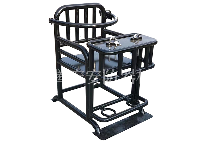 本產(chǎn)品選用均為優(yōu)質(zhì)鋼材彎制焊接而成,管壁為貼標(biāo)2.0厚,包括靠背、座面、椅腿、扶手及胸部約束環(huán),整體重量40公斤。椅子左側(cè)有開(kāi)關(guān),可同時(shí)打開(kāi)前桌門和腳銬,操作簡(jiǎn)單方便,桌面裝有U型鎖或手銬,胸部配有可以調(diào)節(jié)功能裝置約束杠,整體可以固定在地面上。