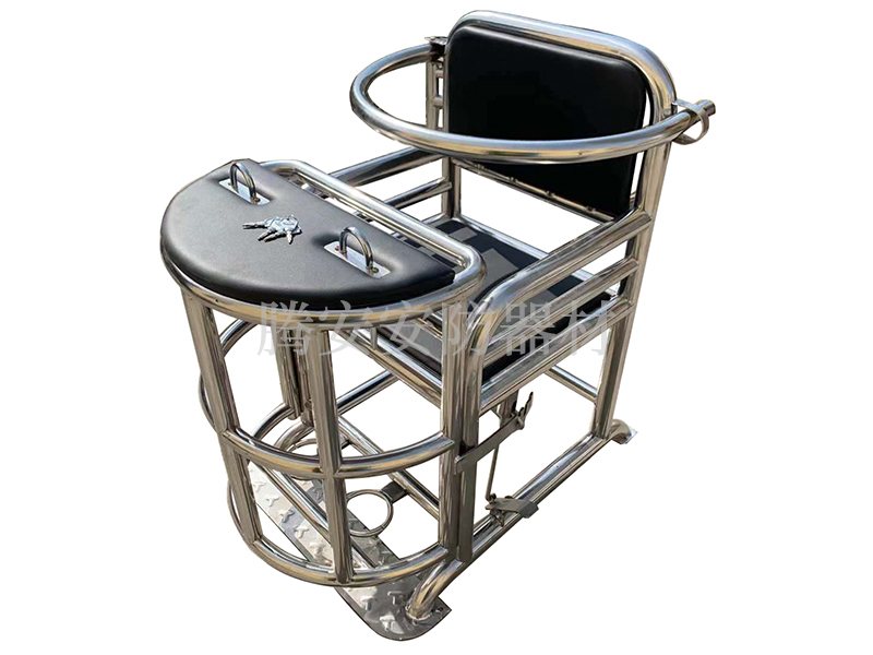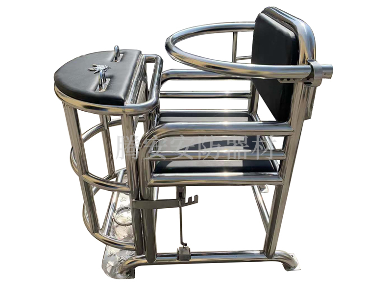 本產(chǎn)品選用均為優(yōu)質(zhì)不銹鋼材料彎制焊接而成,管壁為貼標(biāo)2.0厚,包括靠背、座面、椅腿、扶手及胸部約束環(huán),整體重量40公斤。椅子左側(cè)有腳踏開關(guān),輕踩開關(guān)可同時(shí)打開前桌門和腳銬,并且可以根據(jù)嫌疑人胖瘦有三個(gè)調(diào)節(jié)檔位,操作簡(jiǎn)單方便,桌面裝有U型鎖或手銬,胸部配有自動(dòng)調(diào)節(jié)功能裝置約束杠,桌面、座面和靠背軟包采用優(yōu)質(zhì)皮革,耐磨性能好。腳部使用不銹鋼約束環(huán),椅腿下方裝有直接與地面固定的底盤,可整體固定于地面上。